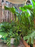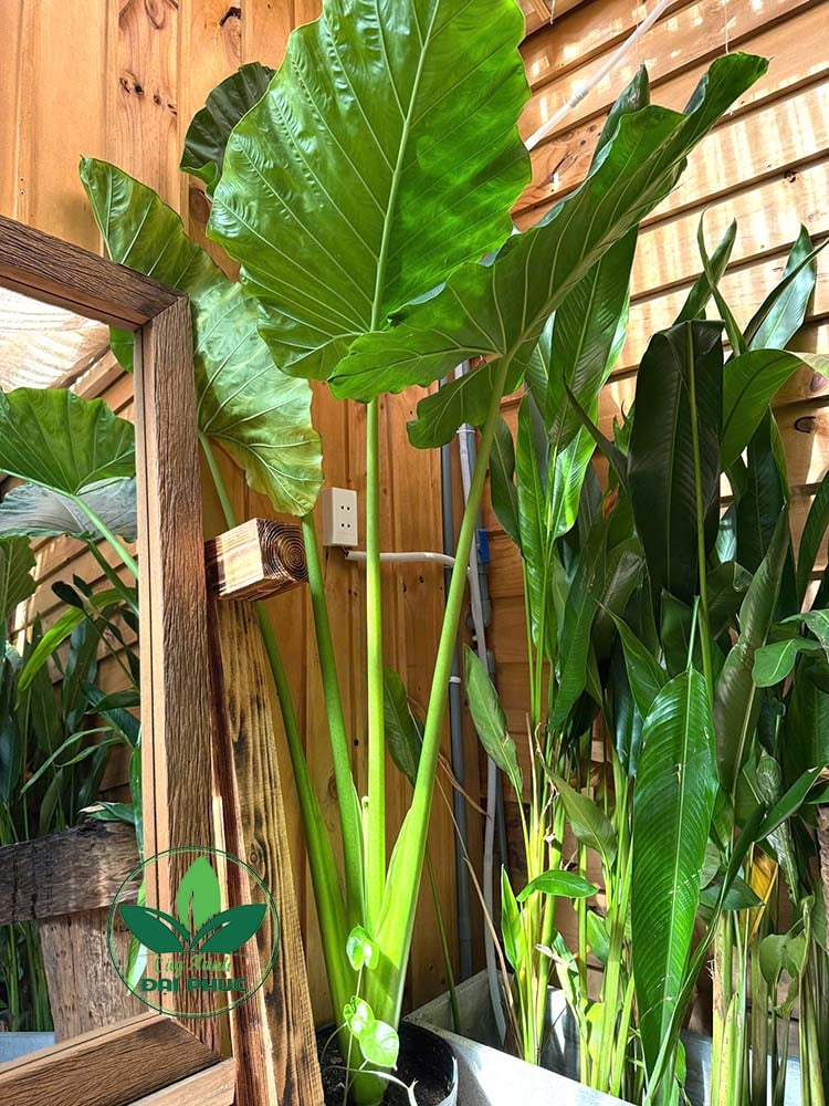 Ráy voi lá lớn xanh đậm, tán rộng tạo điểm nhấn mạnh mẽ cho không gian.