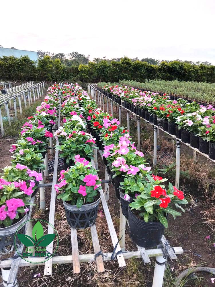 Những chậu dừa cạn khỏe mạnh, lá xanh bóng và nụ hoa dày – sẵn sàng bung nở khi trồng xuống công trình.