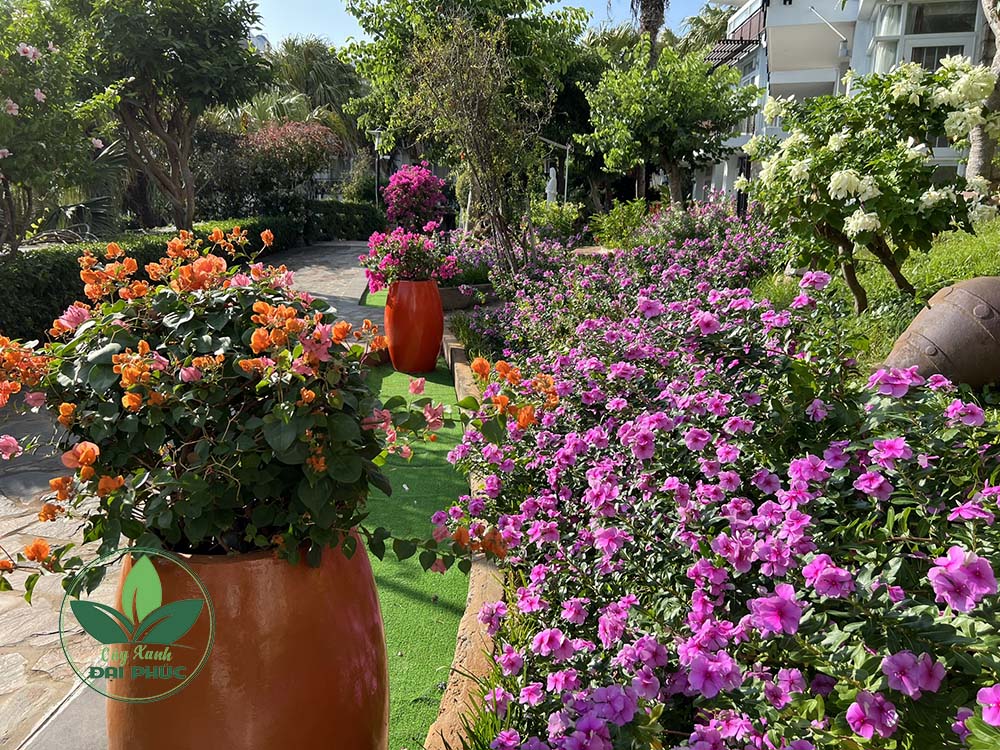 Thảm hoa dừa cạn rực rỡ tạo nên lối đi thơ mộng, nâng tầm cảnh quan biệt thự và resort.