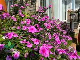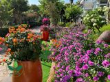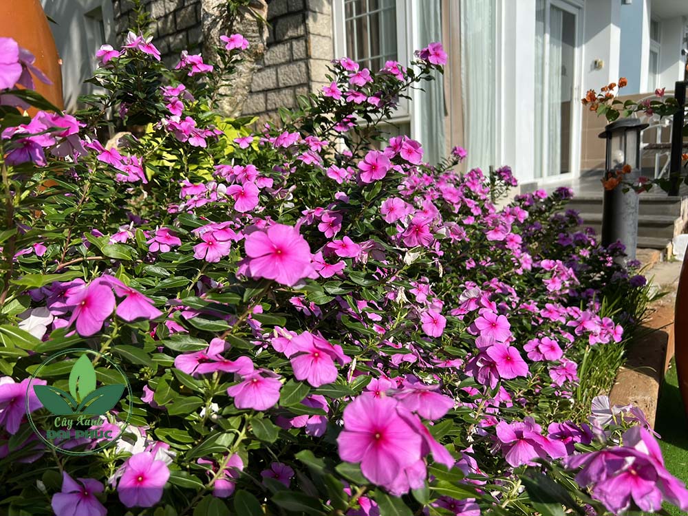 Hoa dừa cạn phủ kín bồn cây, mang lại sắc màu tươi sáng và cảm giác thư giãn cho mọi góc sân vườn.